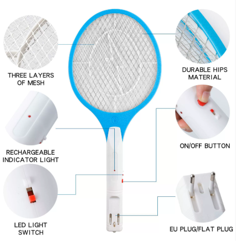 1. Vì sự an toàn của bạn, không chạm vào công tắc và lưới điện khi máy đánh muỗi đang sạc